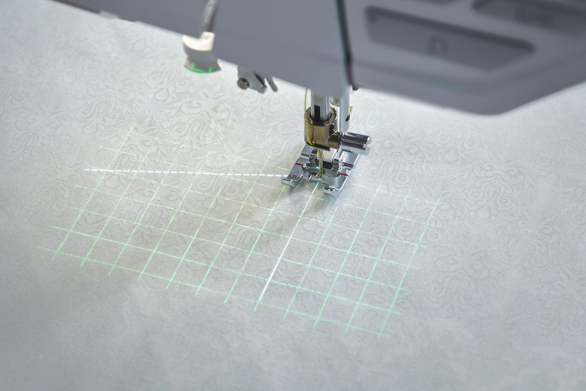 Preview stitches on your fabric before you sew, or overlay alignment lines with adjustable angles and grids for perfect placement.
